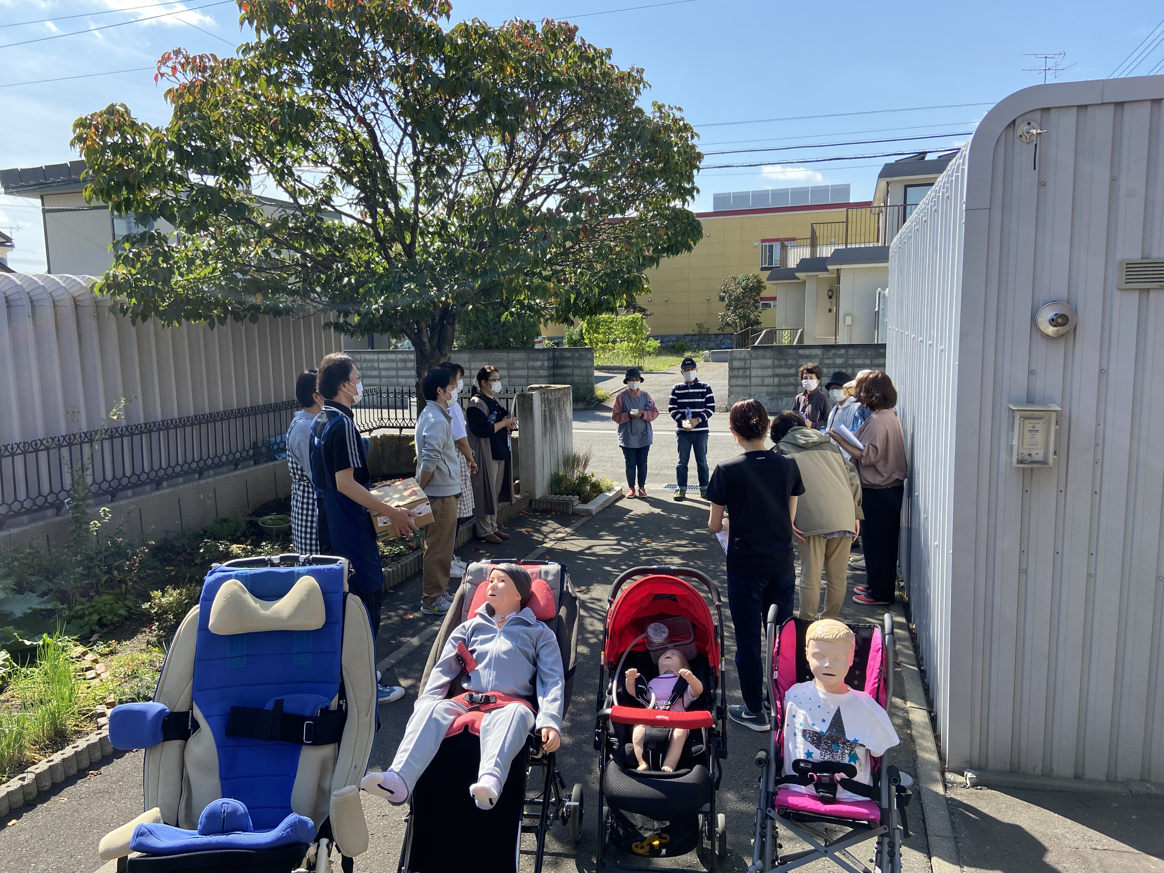 ・ 施設周辺のご近所さまにも一緒に避難訓練にご参加をいただき、